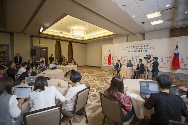 蔡英文總統「自由民主永續之旅」20日下午(臺北時間21日上午)在丹佛與隨團記者茶敘,針對此次出訪過境安排、訪友邦印象最深刻的地方、兩岸政策及臺美關係等議題,回應隨團記者提問。