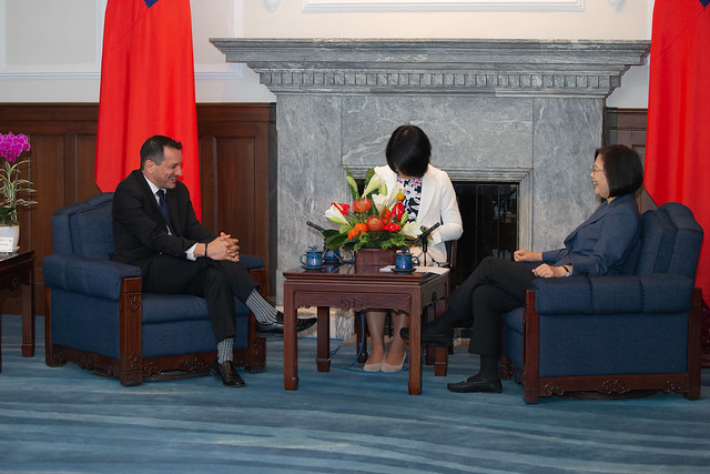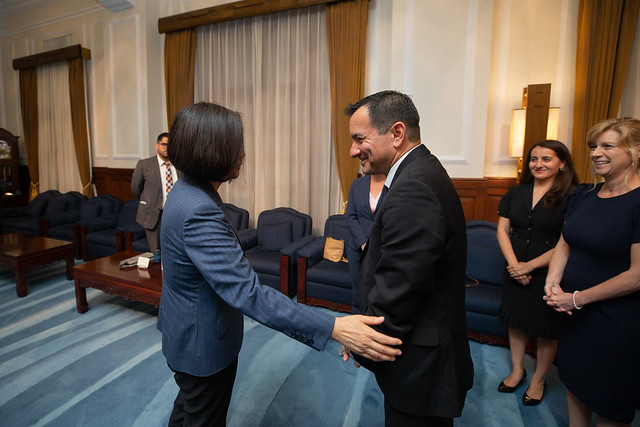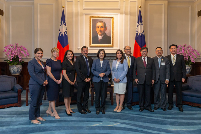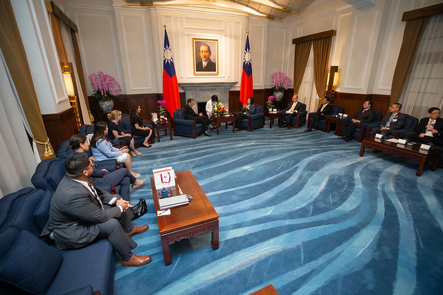訪賓一行由外交部長吳釗燮、桃園市長鄭文燦陪同,前來總統府晉見總統,國家安全會議秘書長李大維及總統府國策顧問田詒鴻也在座。