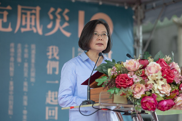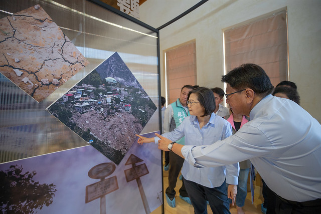 蔡英文總統今(8)日上午前往屏東出席「莫拉克風災十周年紀念特展發表會」,感謝在莫拉克風災重建路上每一個用心付出的朋友,並表示,因應極端氣候的威脅,我們要記取教訓,全面提升臺灣防災的設計和韌性。總統也呼籲國人一起小心警戒即將到來的利奇馬颱風。