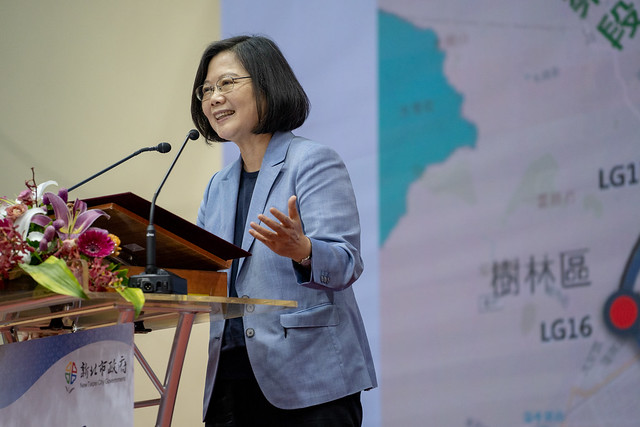 總統致詞時表示,她曾經是新北市長的候選人,現在還是新北市民。作為一個市民,她期待新北市長侯友宜可以多做一些事情。作為總統,她會盡所能來幫助侯市長,讓市政能夠如期如質來執行。她了解新北市民對交通建設的期待,希望能在中央有限的預算中,尋找新的預算空間。也因此政府在一開始執政,就開啟了「前瞻基礎建設計畫」的規畫,其中有很大部分是為了軌道建設,也有很多是北部都會地區的需求。