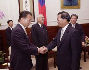 「日本自由民主黨日本.台灣友好議員聯盟」成員米田建三、森岡正宏、松宮勳等三人,上午是由日本交流協會台北事務所所長山下新太郎、亞東關係協會會長林金莖及外交部次長吳子丹陪同,前來總統府晉見總統,總統府秘書長游錫也在座。