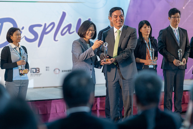 總統進一步指出,在她要頒發的「臺灣數位看板應用大賞」中,獲獎項目包括零售場域的「智慧貨架顯示系統」、超大型的拼接電視牆,以及具有雙向互動功能的導覽機等等。這些都證明了臺灣顯示器產業在軟硬整合、智慧化顯示應用上的成績。