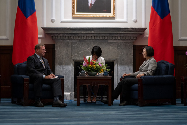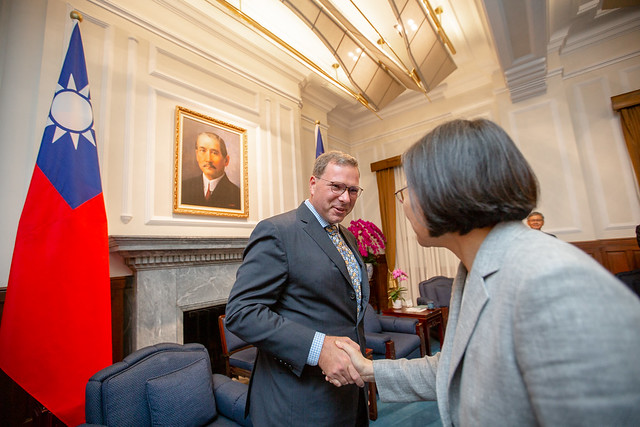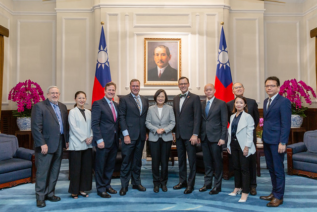 談及臺美經貿合作,總統指出,過去的三年,臺美經貿關係持續深化發展。2018年臺美貨品貿易總額成長了11.5%,將近760億美元。臺灣和美國之間,有堅實的合作發展基礎,現在因為全球貿易局勢變化,帶給我們許多的挑戰,當然也可能是機會,相信未來一定可以共同創造更豐碩的成果。
