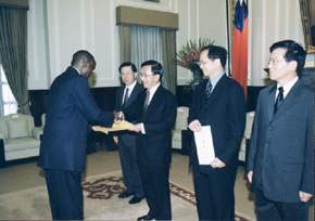 塞內加爾共和國新任駐華大使薩爾(Adama SARR)今天向陳總統水扁先生呈遞到任國書。
