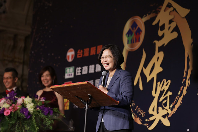 總統致詞時表示,很高興參加「金仲獎楷模頒獎典禮」,和來自全臺灣各地不動產仲介業夥伴,為「房仲業的奧斯卡」得獎者祝賀。