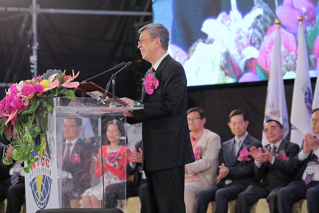 副總統首先恭喜即將上任的施至隆總會長,並表示,相信在施總會長的帶領下,秉持臺商團結合作、攜手打拚的精神,對於未來的會務發展,一定會有積極的突破與精進,臺商總會也將扮演更為重要的角色。副總統也肯定滿任的總會長游萬豐過去一年來的卓越領導與貢獻,並表達感謝與祝福之意。