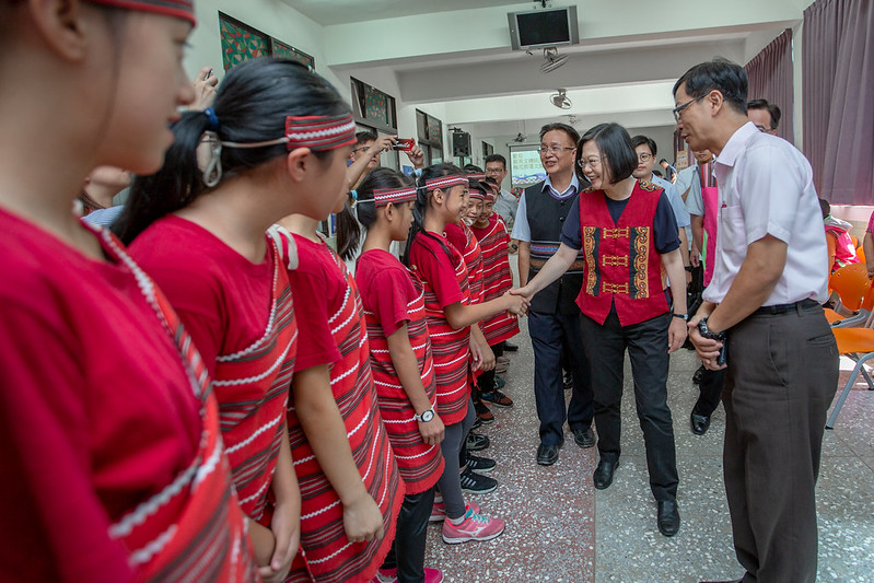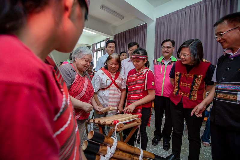 稍早,總統也在原民會主委夷將.拔路兒Icyang‧Parod的陪同下,前往「梅花部落文化健康站」,訪視梅花部落老幼共學情形,也與文健站的長輩及孩童一起體驗傳統木琴的打擊樂趣,現場氣氛溫馨熱絡。