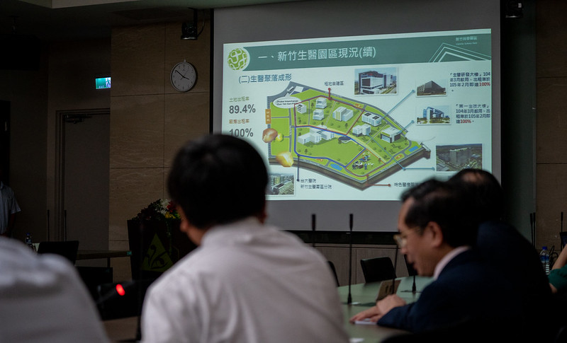 總統首先前往「新竹生物園區生技大樓」聽取簡報,了解新竹生醫園區的整體環境、社區醫療推展及新竹臺大分院生醫醫院的重點特色等。