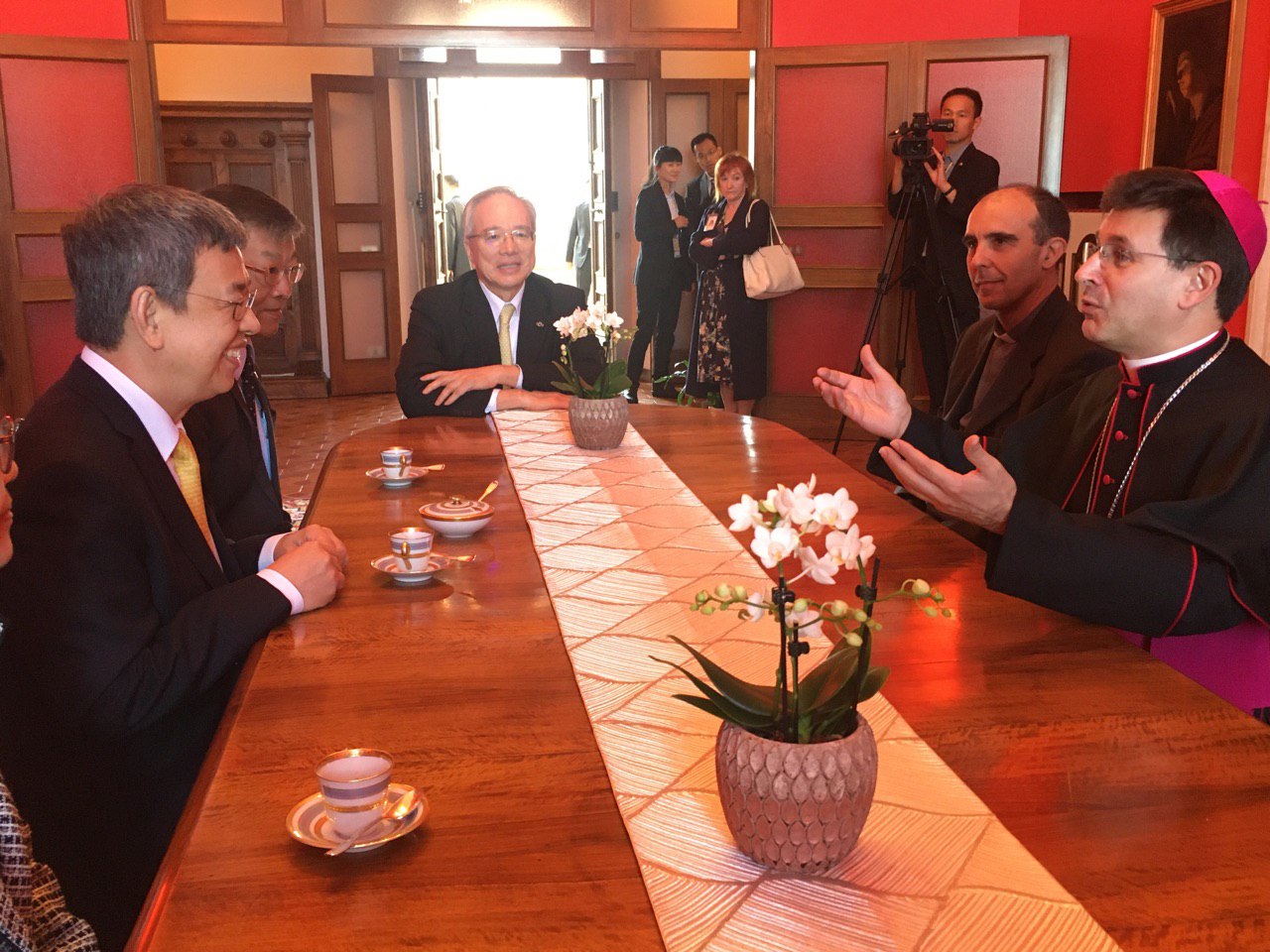 副總統表示,馬可尼主教曾於今年8月到臺灣訪問,他兩個月前也在總統府接待馬可尼主教,很高興在這麼短的時間內,就來到義大利的馬切拉塔教區參訪。這個教區也是與華人文化相關的耶穌會士利瑪竇(Matteo Ricci)的出生教區。事實上,我們對利瑪竇的學問相當尊重,他不僅將哲學、科學的思想帶入中華文化,更製作了中華文化史上第一個世界地圖,讓我們有新文明的開展,深具貢獻。