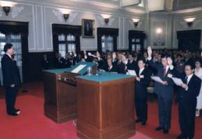 首先舉行宣誓典禮,宣誓人行政院政務委員許志雄、行政院客家委員會主任委員范光群、中央選舉委員會主任委員黃石城、駐巴拉圭共和國特命全權大使顏秉璠、駐查德共和國特命全權大使鄭欣、國家安全會議副秘書長韓、行政院國家科學委員會副主任委員黃文雄、行政院客家委員會副主任委員劉永斌,在總統監誓下,面對國旗、國父遺像,高舉右手,宣讀誓詞:「余誓以至誠,恪遵國家法令,盡忠職守,報效國家,不妄費公帑,不濫用人員,不營私舞弊,不受授賄賂,如違誓言,願受最嚴厲之處罰」。儀式莊嚴隆重。