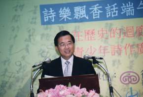 今天也是詩人節,是「詩的國度」的國慶日,阿扁想藉此難得的機會,先向全國長期創作的詩人朋友們致上問候,更要表達最誠摯的敬意,因為各位將語言,精煉成美麗的詩句;將真情,濃縮成讚嘆的意象;將悲歡離合,轉化為一首首透澈關照的詩篇。