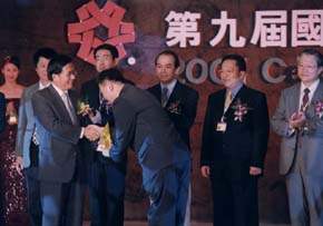 欣逢第九屆「國家產品形象獎頒獎典禮」今天隆重舉行,本人在此僅向全體獲獎的企業廠商申致誠摯的祝賀,並對平日致力研發創新,提昇國家產品形象的個人和團體,再次代表政府表達最高的敬意與謝忱。