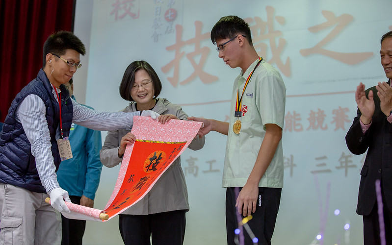 總統指出,今年屏東高工也有很多令人驕傲的成績。機械科三年級蘇柏豪同學每天苦練14小時,在全國技能競賽當中,擊敗已經在工作的業界代表,擊敗大學生,得到模具職類的金牌。