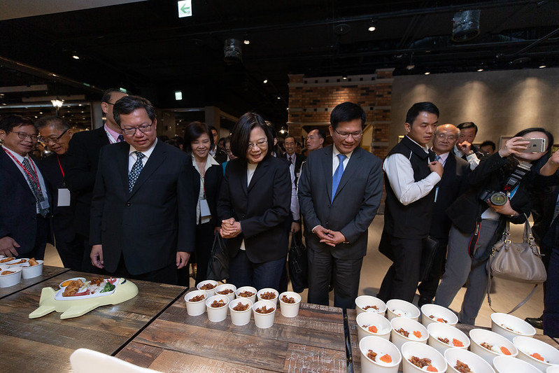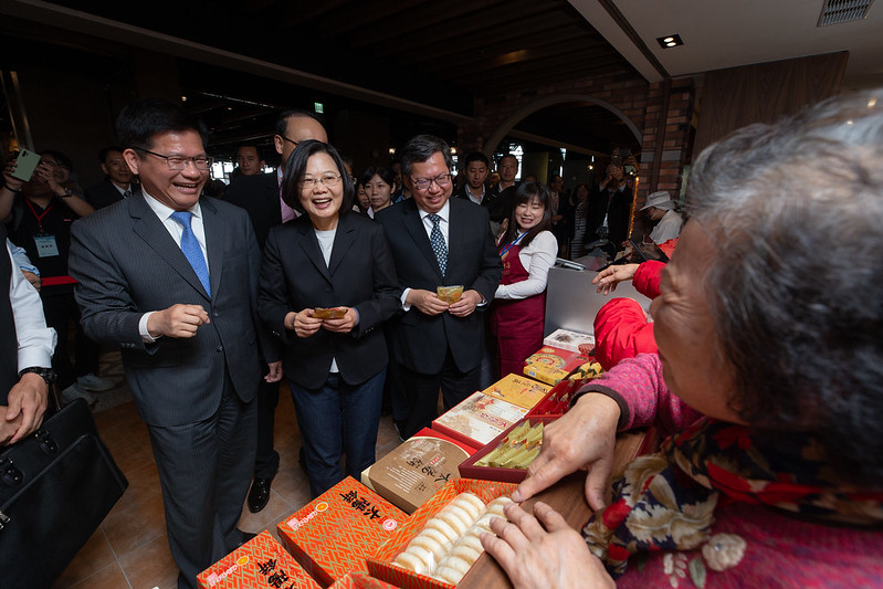 總統提到,今天開幕的「臺灣玩藝大街」重現大稻埕的懷舊風貌,也讓臺灣的美食跟伴手禮走向世界的櫥窗,介紹給全世界的旅客。