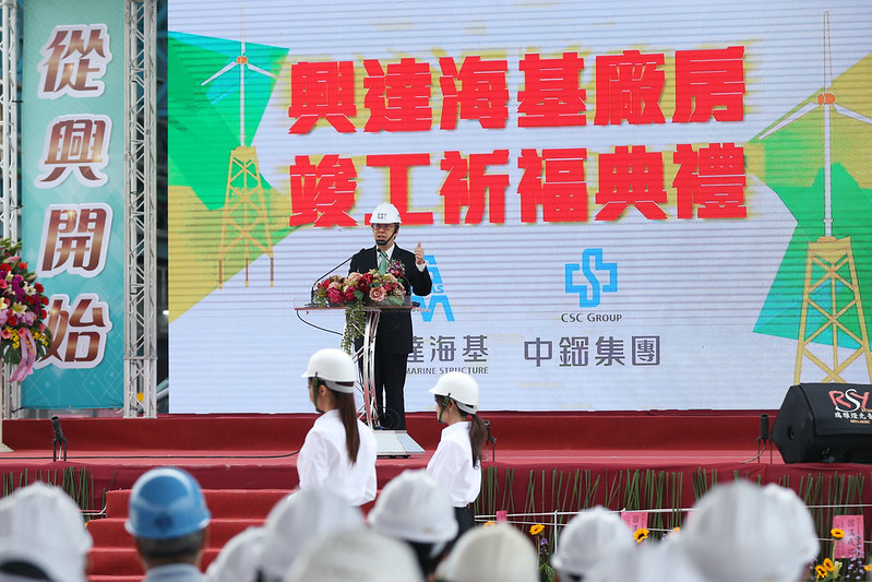 副總統致詞時表示,非常高興來到高雄興達港參加「興達海洋基礎股份有限公司水下基礎廠房竣工典禮」,稍早中鋼董事長翁朝棟提到,廠房當初是由時任高雄市長、現任總統府秘書長陳菊共同破土,本來是24個月要完成,提前在20個月就完成,真的是了不起。這樣的效率及積極,是臺灣產業界相當具國際競爭力的典範。