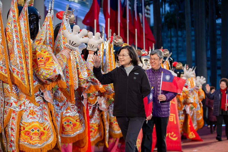 升旗典禮結束後,總統與副總統和現場群眾一起欣賞新港奉天宮電音三太子演出,接著步上舞台,向表演團體擊掌致意,期盼新的一年,國人攜手同心,臺灣前進。