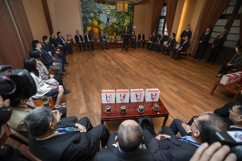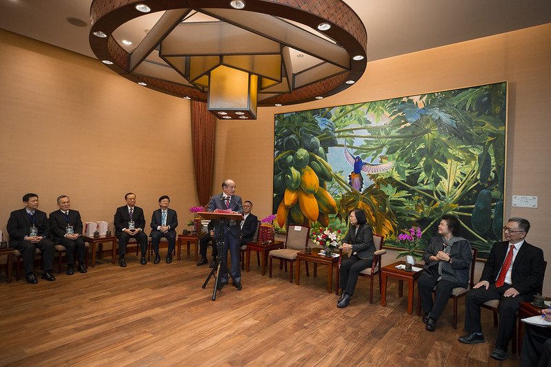 得獎團隊代表一行由生技醫療科技政策研究中心董事長王金平率領,衛生福利部次長薛瑞元陪同,前來總統府晉見總統,總統府秘書長陳菊也在座。