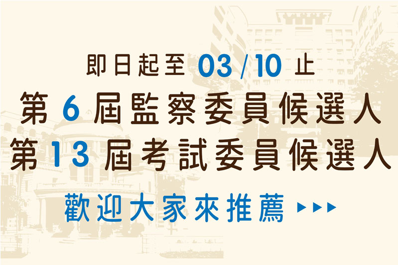 「第6屆監察委員提名審薦小組」及「第13屆考試委員提名審薦小組」公開接受各界推(自)薦,將於109年3月10日(星期二)截止。兩項提名審薦小組召集人陳副總統建仁籲請社會各界把握最後幾天的時間推(自)薦,並請公民團體踴躍推薦人選。