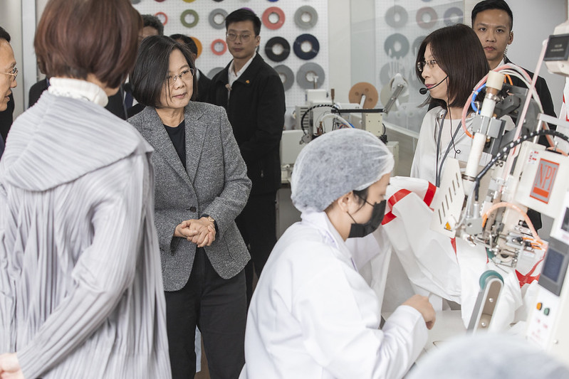 總統抵達後,首先在經濟部次長王美花、「聚陽實業股份有限公司」董事長周理平等人陪同下,參觀該公司隔離衣及防護衣研發製作流程,並聽取資深經理蔡維溢簡報「未來發展防護衣計畫」。