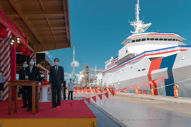 隨後,總統頌命名詞,並在海洋委員會主任委員李仲威陪同下,進行揭牌及下水擲瓶儀式。