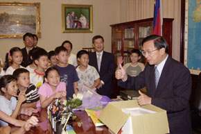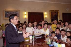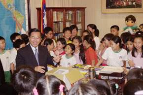台北市東門國小四年一班及四年八班七十一位小朋友,上午是在校長溫明正帶領下前來總統府參觀,並且成為陳總統就任以來,在總統辦公室內首次的小學生訪客,總統除了在辦公室門口迎接這些小訪客外,並親自為小朋友們解說總統辦公室內的陳設。