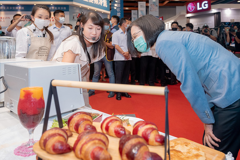總統提到,去年她在這項展覽與大家分享夫妻不吵架的秘訣,就是家裡要有一台洗碗機。今天她要告訴大家,不只是有「三機—洗碗機、掃地機器人、洗脫烘衣機救婚姻」,還有「三倍券拚振興」。