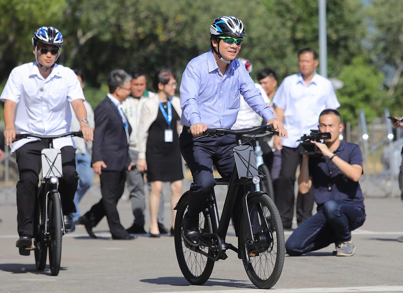 隨後,副總統至該公司三廠產線參觀電力輔助自行車生產線運作,並現場試騎,體驗臺灣製造環保、低污染的代步工具。
