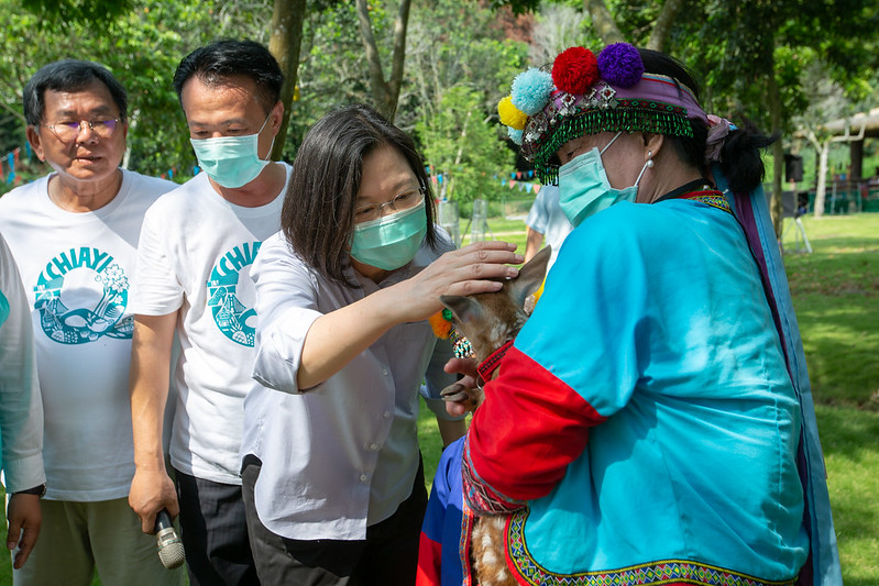 隨後,總統前往「逐鹿部落」,在逐鹿社區合作社理事長莊莫俄導覽下,參觀部落木雕、皮雕等傳統手工藝品及特色禮品攤位;也在阿里山冠軍咖啡農方政倫協助下,親自體驗手沖咖啡及品嚐香醇美味的咖啡,並使用三倍券及現金購買冠軍咖啡禮盒,為辛苦的農友加油打氣。總統還特別為梅花鹿園區內剛出生10天的小梅花鹿命名為「Q弟」,鼓勵國人多來遊玩。