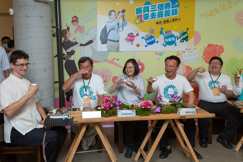 總統首先抵達嘉義牛埔仔大草原愛情圖書館,參觀現場多家在地特色伴手禮攤位,並使用三倍券及現金購買「旺萊山」鳳梨酥。總統也親自製作及品嚐美味的鳳梨酥,觀賞臺式功夫泡茶藝表演及品茗好茶;接著,總統驅車前往「觸口龍隱寺」參拜,祈求臺灣風調雨順、國泰民安。