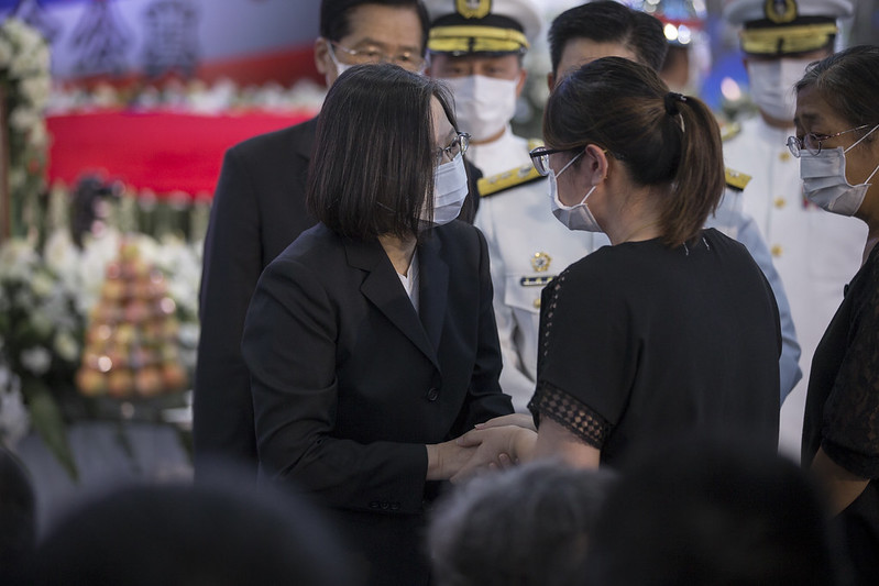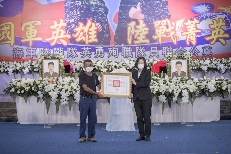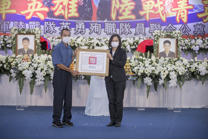 蔡英文總統今(26)日上午前往高雄左營海軍軍官學校親頒褒揚令,表彰殉職海軍陸戰隊隊員陳志榮三等士官長及蔡博宇下士對國家的付出與貢獻。