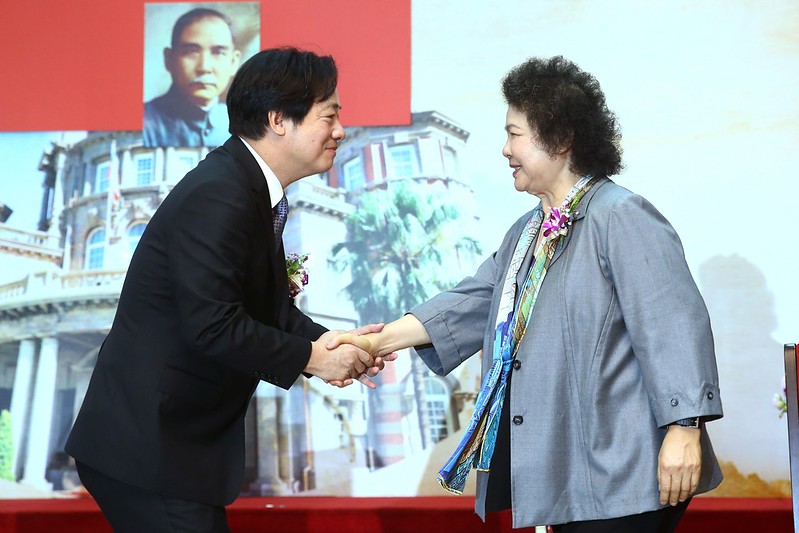副總統說,新任陳院長,也是大家所熟悉的菊姐,在當年高壓威權的年代,她很年輕就投入爭取臺灣民主、自由、人權的工作。即便是在美麗島大審面對唯一死刑的威脅,仍然在庭上大聲疾呼國家邁向民主、自由、人權的重要,正義凜然,令人欽佩。因緣巧合之下,陳菊女士走入體制內,不管是在臺北市或高雄市社會局長任內,照顧弱勢、落實社會公益;擔任勞委會主委時,是第一名的閣員;擔任高雄市長時,是五星級的市長,深獲人民的愛戴;擔任總統府秘書長時,更協助蔡總統推動國政,成功連任,得到了817萬票人民的支持,寫下民主史頁上傳奇的一章。