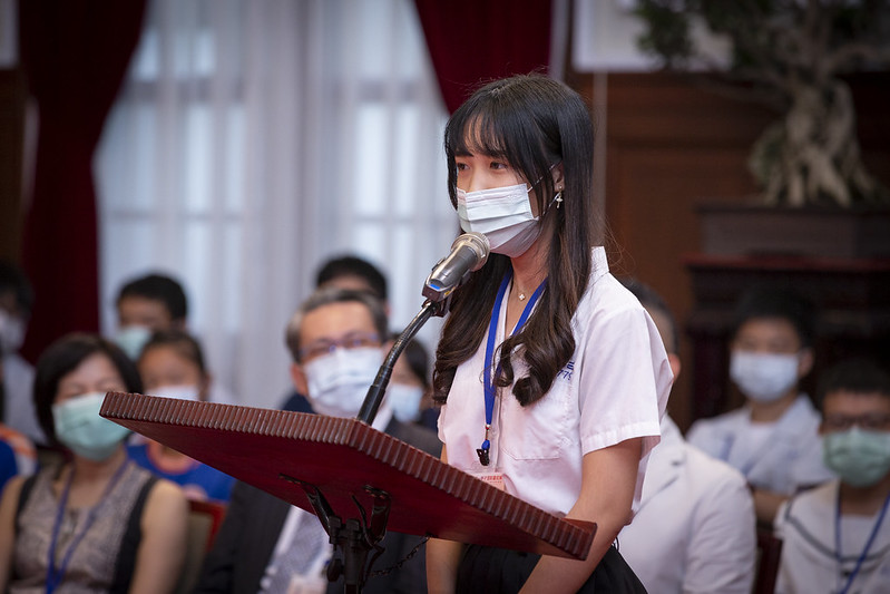 總統致詞時首先歡迎得獎師生。她表示,今年雖然受到疫情影響,不過邁入第60屆的「全國中小學科學展覽會」還是順利舉辦,這對臺灣來說,是一個很正面的好消息。