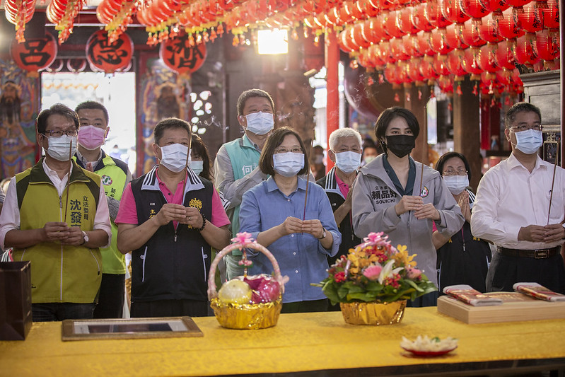 總統抵達「三峽祖師廟」時,受到現場民眾熱情歡迎,並以主祭官身分上香、獻花、獻果,祈求臺灣四季無災、八節有慶。總統也另前往「汐止濟德宮」,向媽祖參拜,祈求風調雨順,讓國人萬眾一心、和睦相處。
