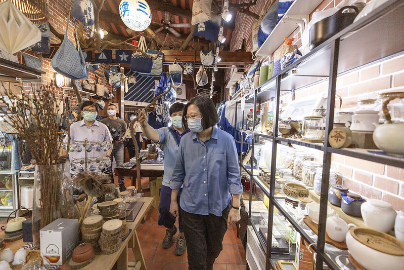 期間,總統也前往「三峽藍染遊客服務中心」參觀,在「青出於藍染工紡」店長劉永豐的導覽下,了解當地藍染產業文化變遷與振興,也運用橡皮筋、繩子、夾具等道具,親自體驗綁紗與藍染的DIY過程。