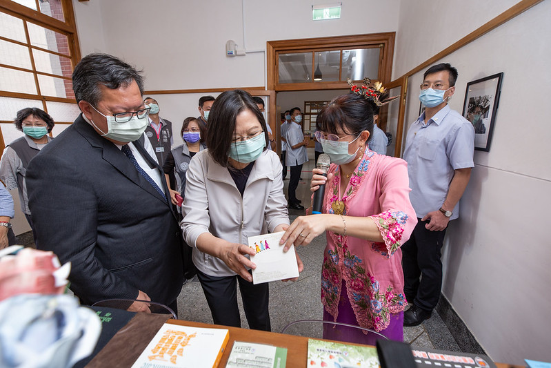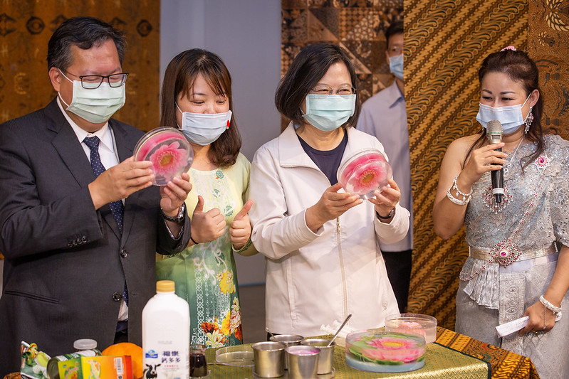 總統首先參訪「桃園市新住民文化會館」,由印尼籍通譯陳麗珠導覽參觀會館,暸解館內服務項目,並現場體驗製作果凍花,與新住民朋友親切互動,氣氛溫馨愉悅。
