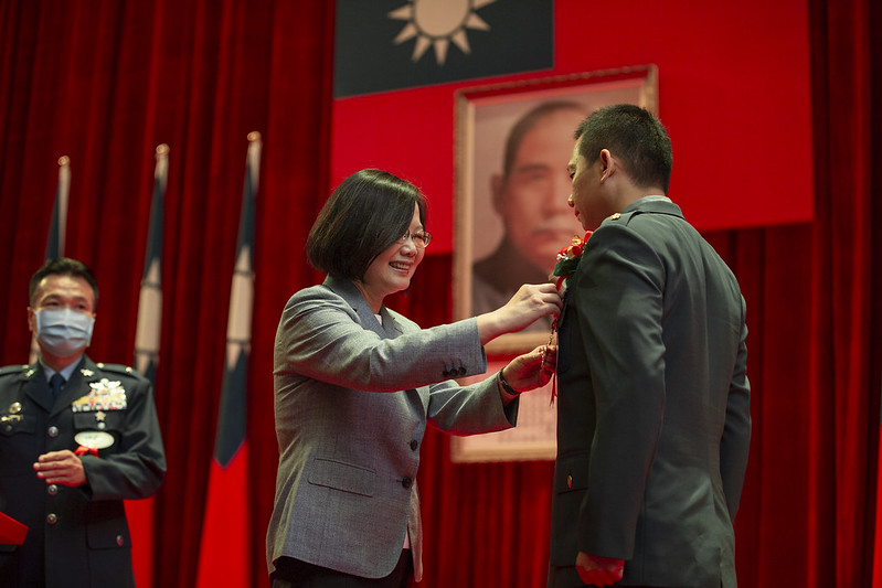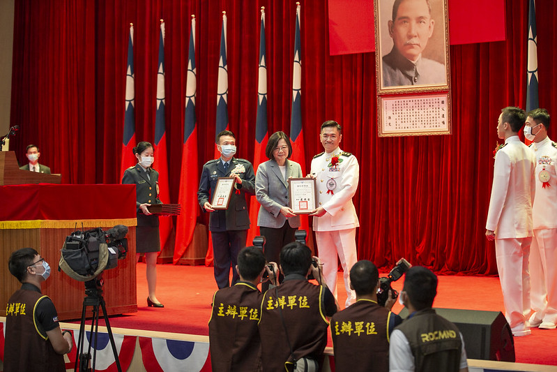 談及國軍官兵的優良事蹟,總統指出今天獲獎的王聖達連長,帶領陸軍三三化兵群偵四連的弟兄姊妹,背負重達35公斤的消毒器,在深夜裡執行任務。今年2月,她前去部隊視導時,儘管天氣還算涼爽,但全套防護裝備之下,國軍弟兄姊妹還是汗流浹背,相當辛苦;海軍一四六艦隊,子儀軍艦的洪佳瑜上兵,在左營長大,從小立志要當海軍,即時每次出海都要10幾天,槍帆兵的任務也很辛苦,但她都甘之如飴,成為楷模之一。