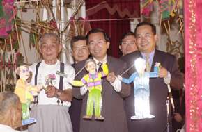 陳總統水扁先生今天出席在總統府介壽堂舉辦的總統府地方文化展-高雄縣「綠色南國、海鷗飛揚」開幕茶會,總統並與高雄縣長余政憲、國寶級皮影藝師許福能老先生及高雄縣竹圍國小五年級唐婉婷同學共同對話演出一段皮影戲,同時歡迎全國民眾前來總統府參觀此項展覽,感受高雄縣的熱情與活力。