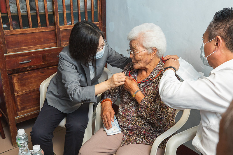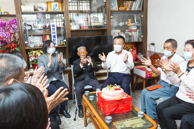 總統分別致贈兩位老人家金鎖片、水果禮盒,並親自為他們掛戴金鎖片及共切蛋糕,祝福他們身體安康、福壽延年。