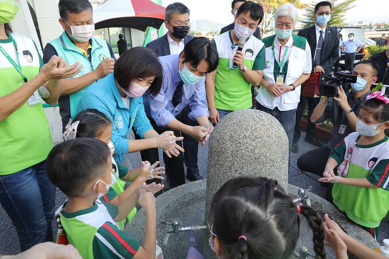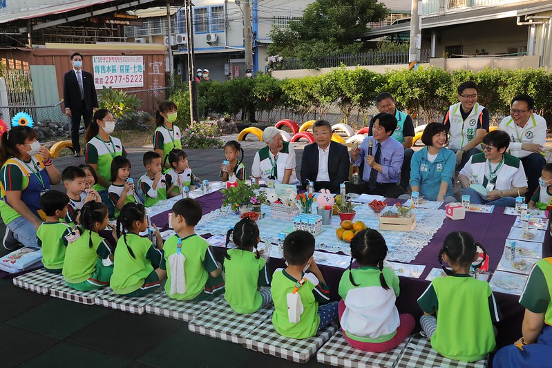 副總統帶著小朋友們一起洗手,並在戶外野餐區席地而坐,共享點心。席間,副總統也與他們進行互動問答,詢問大家防疫期間平日生活的衛生保健問題,小朋友們則爭相搶答。