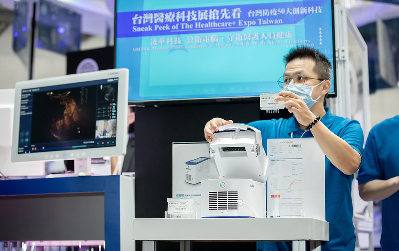 隨後,總統參觀現場所展示的全自動核酸檢測設備、公衛防疫電腦及零接觸防疫科技平台等創新科技,了解我國在檢測科技、遠距科技及環境感控等領域的研發成果。