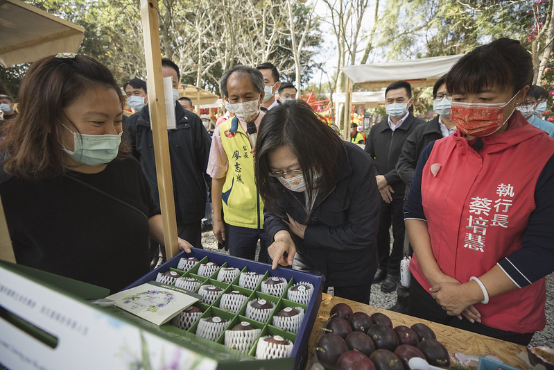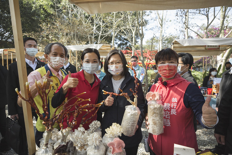 接著,總統也前往由埔里鎮、仁愛鄉、魚池鄉與國姓鄉等4個鄉鎮聯盟組成的農特產伴手禮市集,參觀現場展示的水果、香菇、茶油、咖啡、手工甜點等攤位,總統也讚許南投在地農民的用心與創新,展現南投的農業實力。