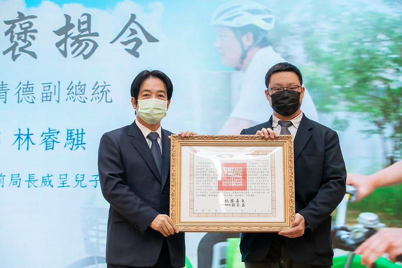 賴清德副總統今(9)日上午前往科技部南部科學園區管理局,出席「感念林前局長威呈分享會」,並代表蔡總統頒贈褒揚令,由林前局長長子林睿騏先生代表接受,以表彰林前局長為臺灣科技發展的貢獻。