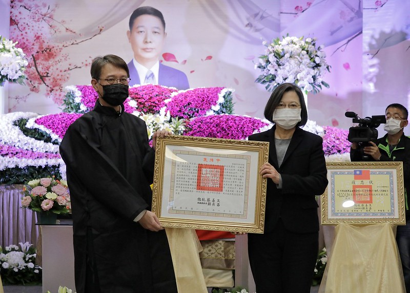蔡英文總統今(12)日下午前往臺北市第二殯儀館親頒褒揚令,表彰古寧頭戰役國軍英雄熊震球先生守護國家的犧牲與奉獻。