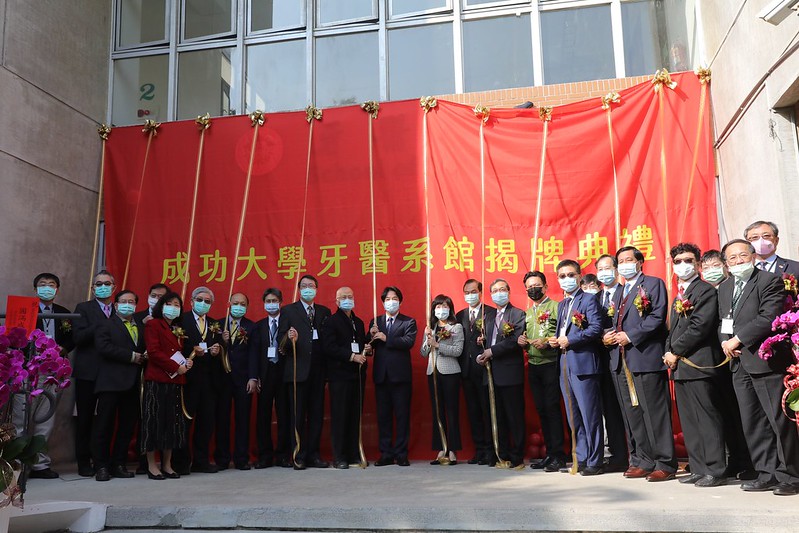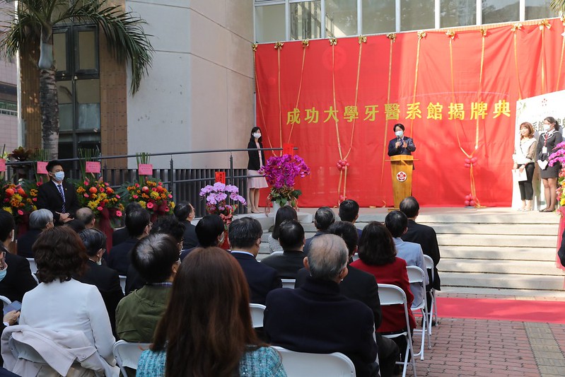 隨後,副總統在牙醫系館外廣場為牙醫學系暨口腔醫學研究所系館揭牌,並前往牙醫系一樓大廳出席「南科牙材體驗教室揭牌典禮」,聽取成大牙醫系主任莊淑芬簡報該校執行南科計畫的成果。