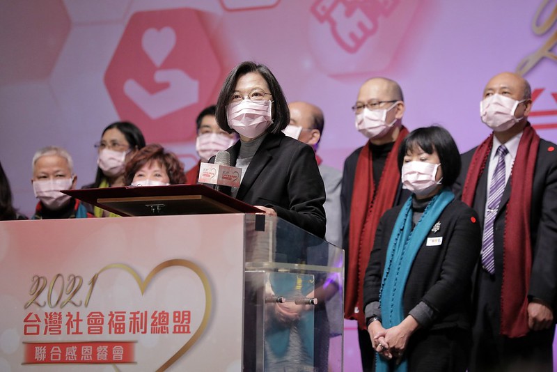 蔡英文總統今(18)日晚間出席「2021年台灣社會福利總盟聯合感恩餐會」,對總盟及各NGO長期為兒少及弱勢族群等爭取權益,並在過去一年協助宣傳政府防疫措施,團結對抗疫情,表達由衷肯定與感謝之意。