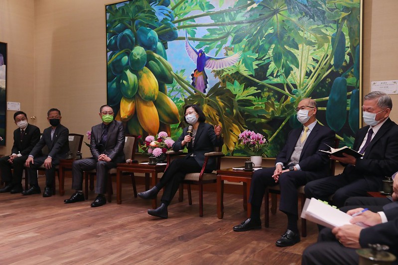 總統感謝太陽光電發電系統公會蔡宗融理事長,不但大力支持政府的政策,這幾年給她許多溫暖,今天還帶公會的夥伴一起前來總統府交換意見;她也感謝太陽光電發電系統公會,這幾年積極貢獻專業意見,在很多會議上都有公會代表參與,協助政府擬定和推動政策。