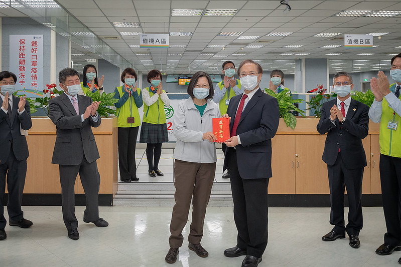 隨後總統並致贈加菜金,感謝1922防疫專線同仁們的辛勞與付出,由中華電信股份有限公司董事長謝繼茂代表接受。