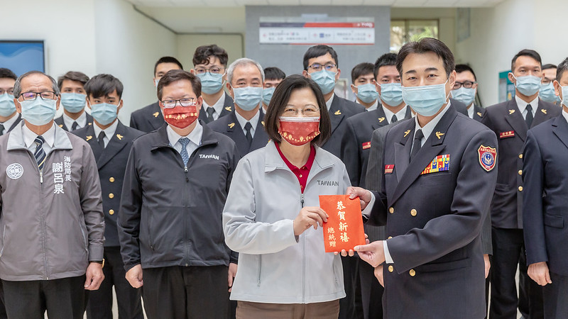 之後,總統前往桃園市政府消防局桃園分隊,除聽取消防局長謝呂泉簡報去年迄今的防疫專案任務,也現地視導瞭解同仁平時勤務情形,並致贈加菜金,由大隊長賴志忠代表接受。