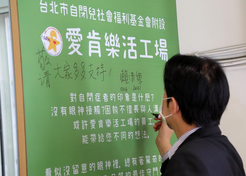 賴清德副總統今(16)日上午參訪「財團法人台北市自閉兒社會福利基金會附設愛肯樂活工場」,肯定愛肯樂活工場的專業,培養學員工作的能力,也在過程中建立起互動的感情;他呼籲國人一起支持學員們的產品,大家每多出一份力量,他們的生活就多一份安穩,就能夠繼續成長。