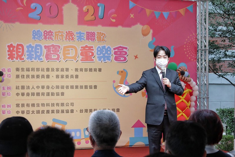 賴清德副總統今(28)日下午出席由「社團法人中華身心障礙者職業技藝協會」於總統府南苑舉辦的「2021總統府歲末聯歡—親親寶貝童樂會」時表示,政府責無旁貸地站在第一線,針對各個不同領域的身心障礙者給予幫助。